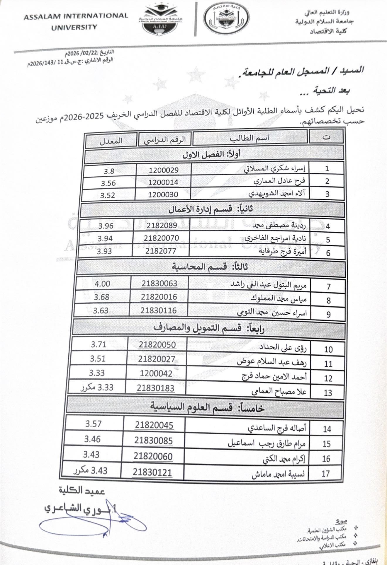 نُبارك بكل فخرٍ واعتزاز لطلبة الأوائل بكلية الاقتصاد
