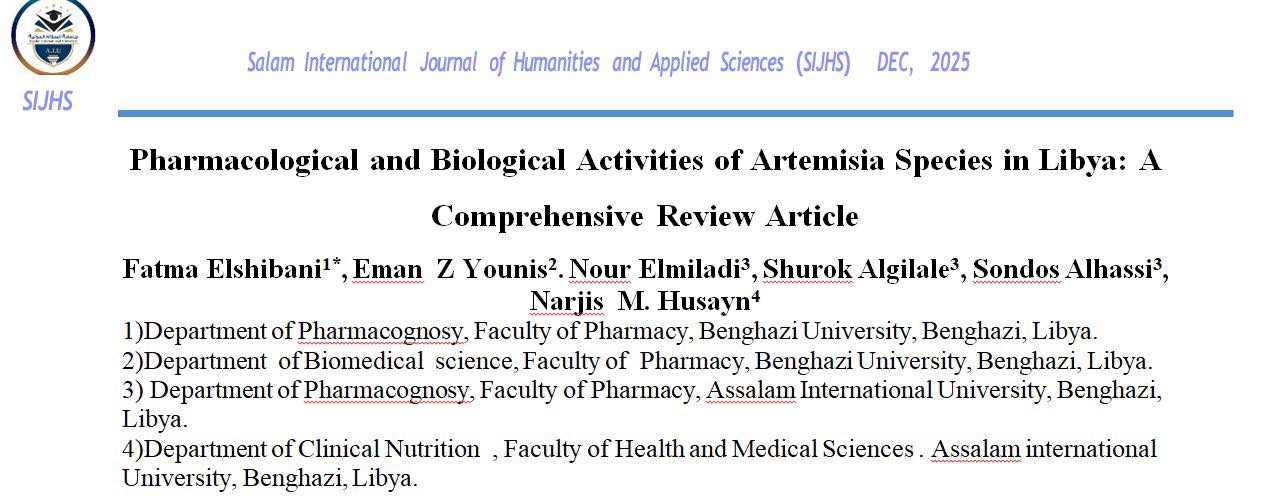 تفتخر كلية الصيدلة وكلية العلوم الصحية والطبية بجامعة السلام الدولية بالإعلان عن نشر ورقة بحثية علمية مميزة في مجلة السلام الدوليةSalam International Journal of Humanities and Applied Sciences (SIJHS) بمشاركة نخبة من أعضاء هيئة التدريس وبمساهمة فعّالة من طلبة الكليتين، وذلك في مجال النواتج الطبيعية والأنشطة الدوائية.